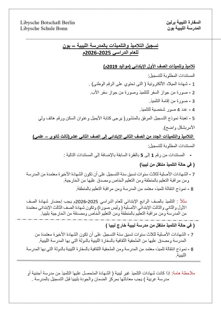 نرجو من أولياء أمور التلاميذ والتلميذات الراغبين في تسجيل أبنائهم بالمدرسة الليبية – بون ملء نموذج تسجيل تلميذ/ة المرفق، وتوفير المستندات المطلوبة المرفقة بالمنشور مع الإطلاع على ماورد به.